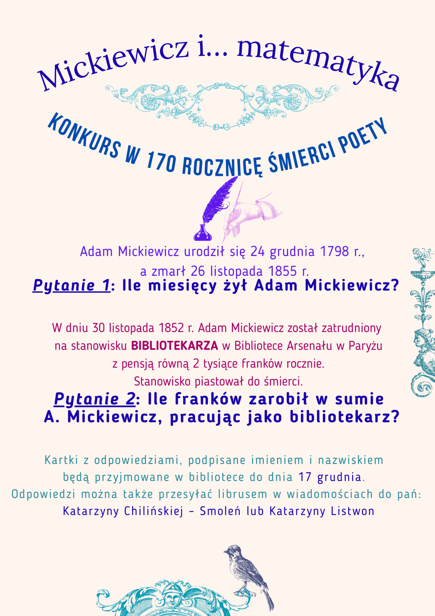 W listopadzie w bibliotece można oglądać mini-wystawę z okazji 160. rocznicy śmierci Adama Mickiewicza i wziąć udział w konkursie "Mickiewicz i ... matematyka"
